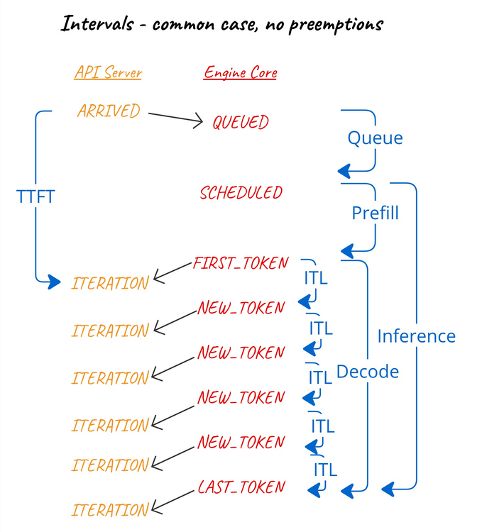 The engine core will also record the timestamp of certain per-request events so that the frontend can calculate the interval between these events.